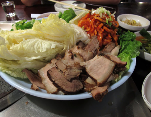 ▼ 生蠔 燒豬肉 泡菜 包在捲心菜裡一起吃 可搭配辣椒還有大蒜瓣, 然後沾豆瓣醬和辣醬. 如果不介意整嘴大蒜味包大蒜美味度有加分效果.