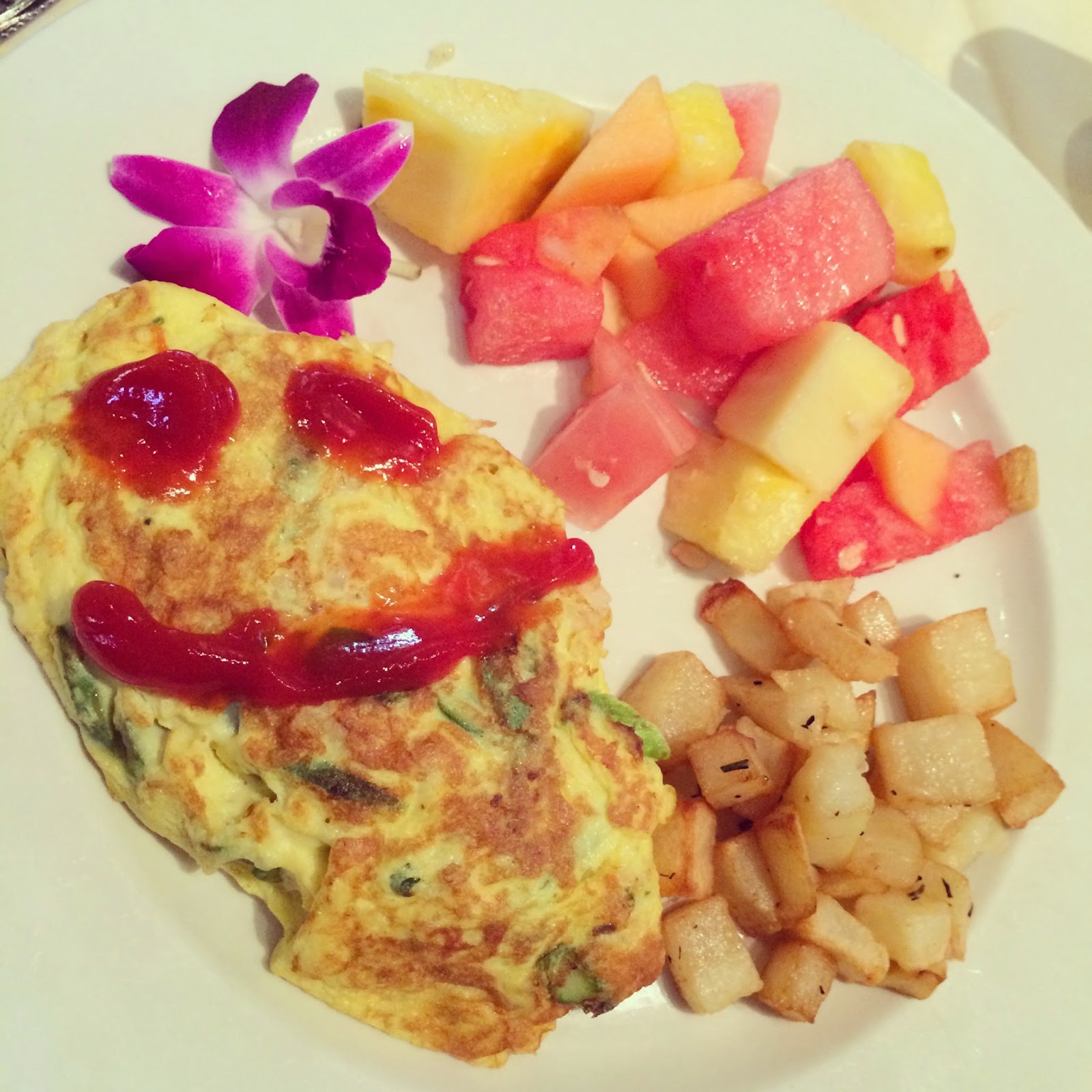 Custom Made Omelette ~ Ham, Cheese, Parmesan, Spinach, Mushrooms, Onions; served with Breakfast Potatoes