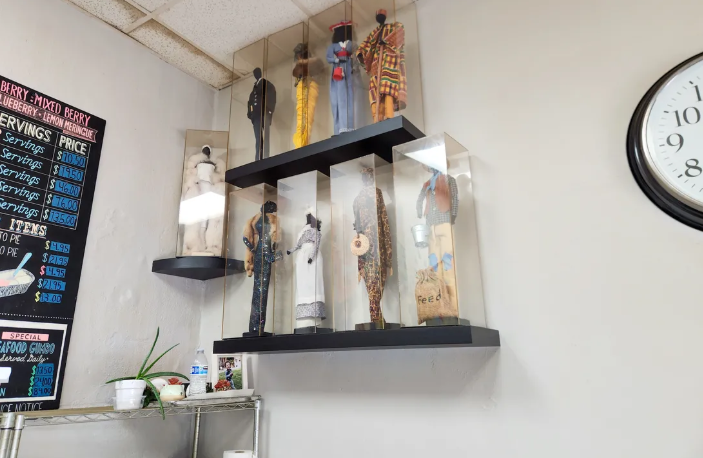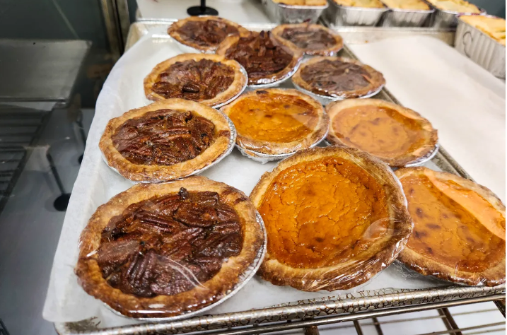 頂部小心地放上雙層酥皮;寬條的酥皮交織放在一起,看起來像是方格在交錯編織。果餡餅和派有不同的尺寸:最受歡迎的果餡餅尺寸是8 x 10英寸。但4 x 6英寸的烤果餡餅賣得最為暢銷。在這裡,各種各樣的人都會來訂購,並將他們的果餡餅帶到生日派對、婚禮和葬禮上。