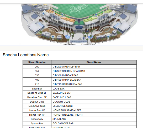 二階堂與道奇隊於2025年初合作,將這款日本蒸餾酒指定為球隊的官方燒酎。二階堂燒酎以大麥製成,球場內各處皆可找到(見下方地圖)。