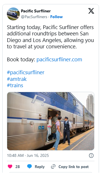 自 2025 年 6 月 16 日起,美铁(Amtrak)在洛杉矶与圣地牙哥之间的 Pacific Surfliner 太平洋冲浪者号路线 增加了一组往返班次,使每日总班次提升至 12 趟往返列车,并新增了更符合夏季旅行需求的午后与夜间出发选项!!