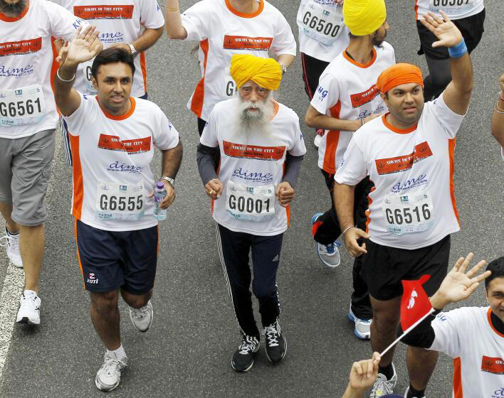 Centenarian marathon runner Fauja Singh, center, runs in a 10-kilometer race at age 101, part of the annual Hong Kong Marathon in Hong Kong on Feb. 2013. Singh died at 114. ((Kin Cheung / AP))