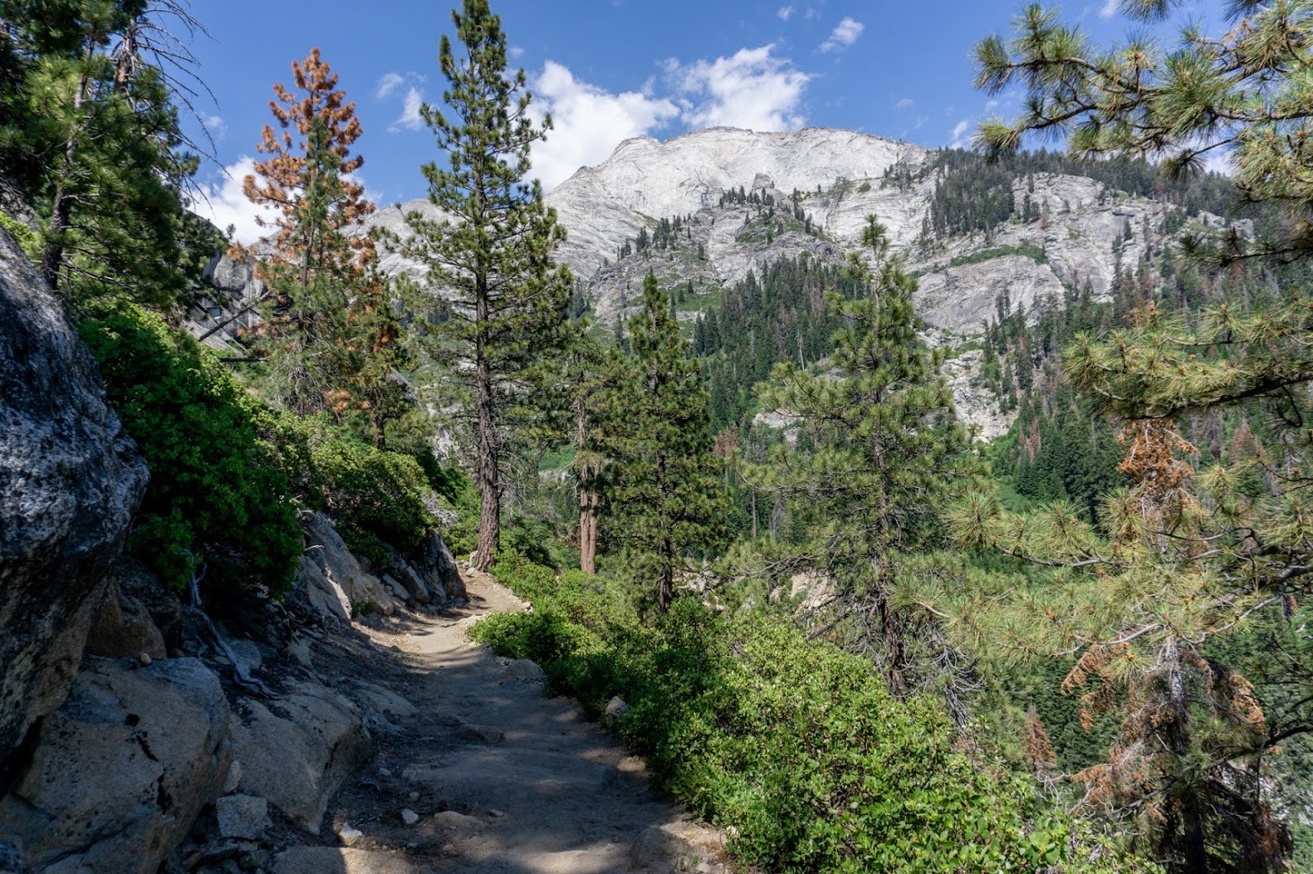 步道接著穿越茂密林地,遠方可望見 惠特尼山(Mount Whitney) 和 卡威亞山(Mt. Kaweah),途中會經過一間舊木屋與一片曾被野火燒毀的林區,之後一路陡降至 克恩河峽谷(Kern River Canyon),那裡常見響尾蛇出沒。
