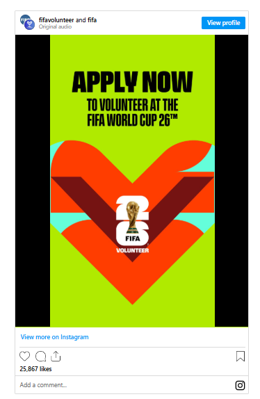 「志工是 FIFA 赛事的核心、灵魂与微笑。」FIFA 主席在官方志工招募声明中表示:「他们能展现当地的骄傲,从幕后视角体验赛事,并创造一生难忘的回忆与友谊,同时支持一场历史性盛事。我们希望有兴趣的人能加入我们,2026 年在北美迎接全世界的到来。」