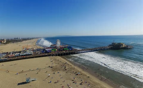 An aerial view of beachgoers at the Santa Monica Pier in Santa Monica, California.