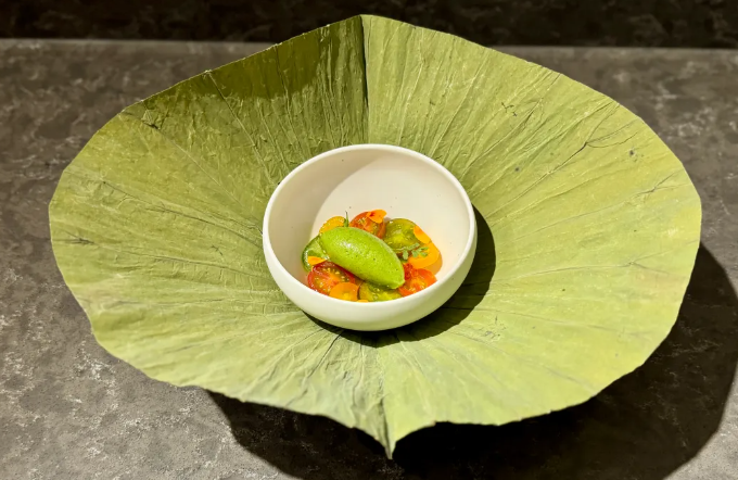 - 一球紫蘇冰淇淋放在傳家番茄與義大利乳酪上,帶有韓式卡布里風味的清香感