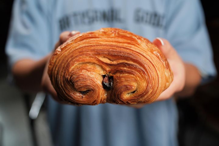 他們家超人氣的就是巧克力可頌,可說是全店焦點。切開後,能看到層層分明、完美的酥皮結構,以及三大片精心調溫的濃郁巧克力塊。由於店家只在熱騰騰時供應,每一口都能感受到融化巧克力的香滑滲透。