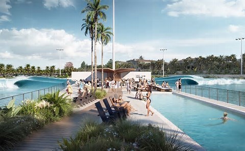 A new wave pool called Snug Harbor using Wavegarden technology is being proposed for Newport Beach, a 5-acre pool expected to open by spring 2028 if approved. (Renderings courtesy of MVE + Partners)