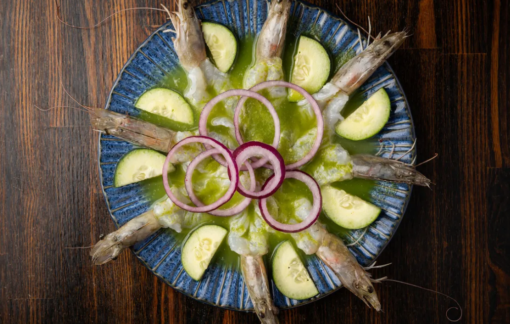 Ceviche de camarón 則以生切蝦肉拌入青辣椒與萊姆汁製成的醬汁,再加入紅洋蔥、黃瓜與番茄丁,最後以鹽和胡椒調味。