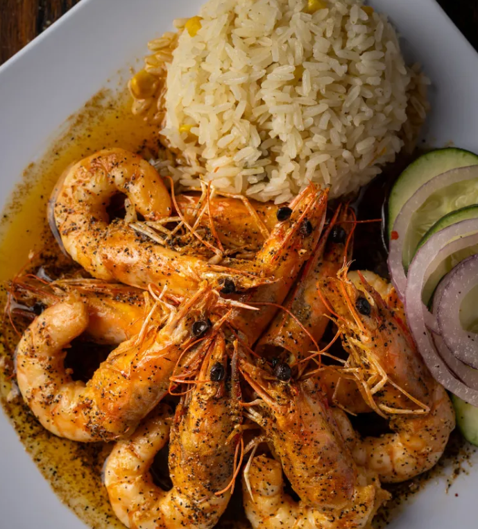 Camarones a la pimienta with rice, cucumbers, and onions.